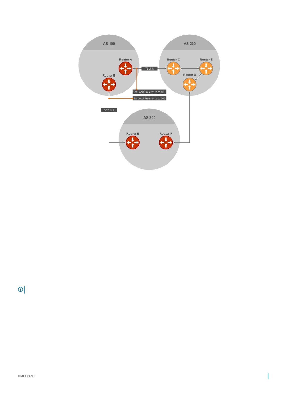 only attribute applied. In the following illustration, AS100 and AS200 connect in two places. Each connection is a BGP session. AS200 sets
