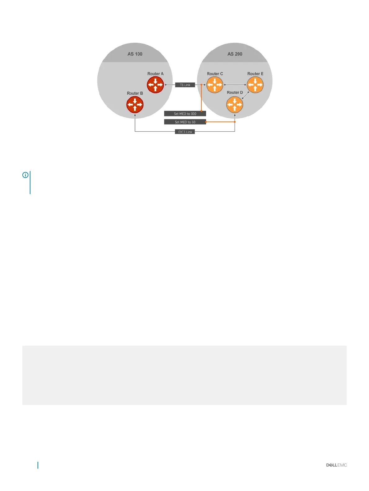 NOTE: Conguring the set metric-type internal command in a route-map advertises the IGP cost as MED to outbound