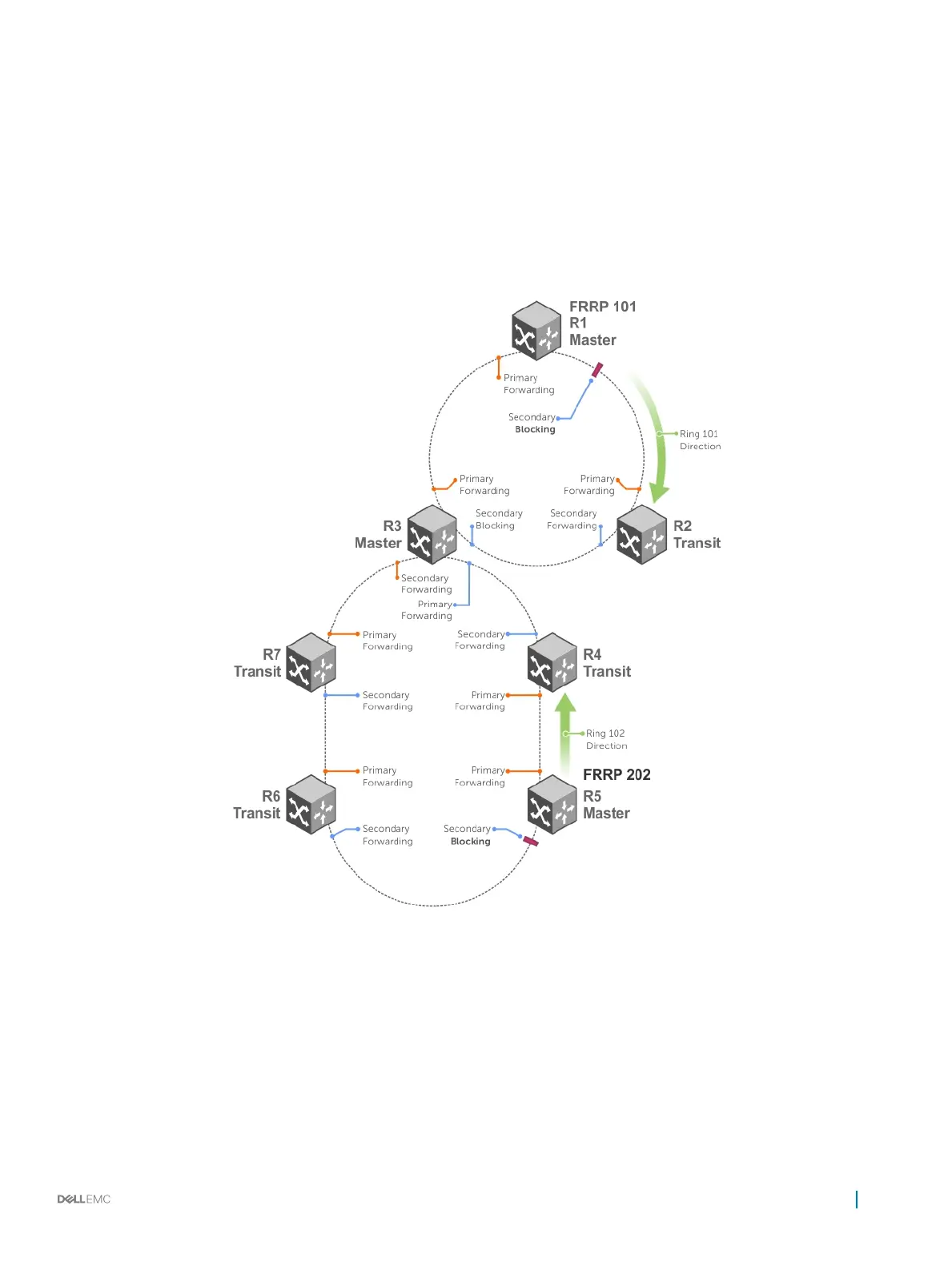on it: one for each ring. The example topology that follows shows R3 assuming the role of a Transit node for both FRRP 101 and FRRP 202.