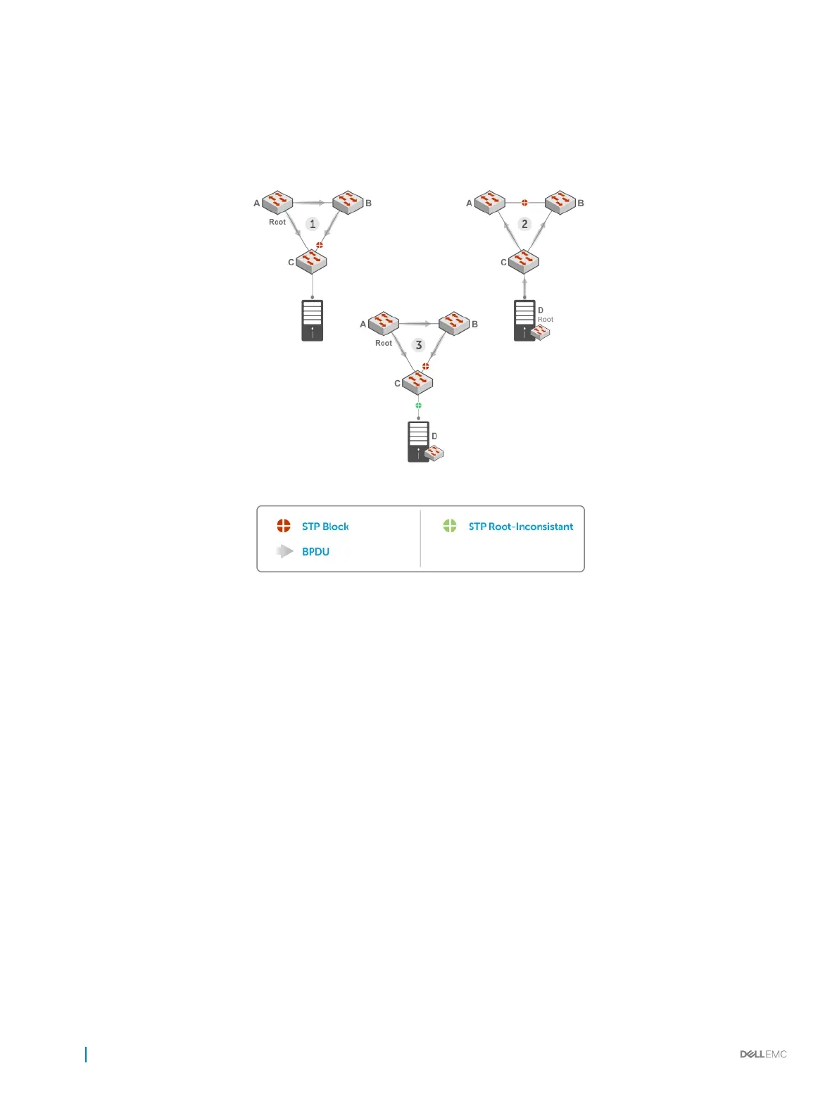 Dell Networking OS Behavior: The following conditions apply to a port enabled with STP root guard: