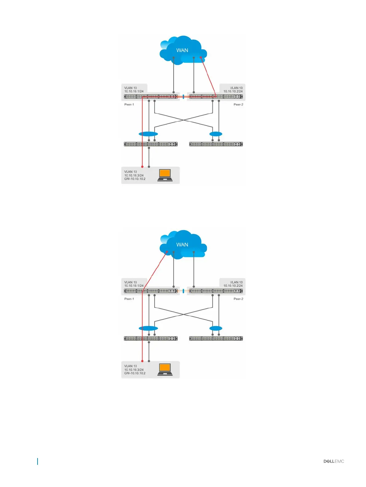 If you enable peer routing, a VLT node acts as a proxy gateway for its connected VLT peer as shown in the image below. Even though the