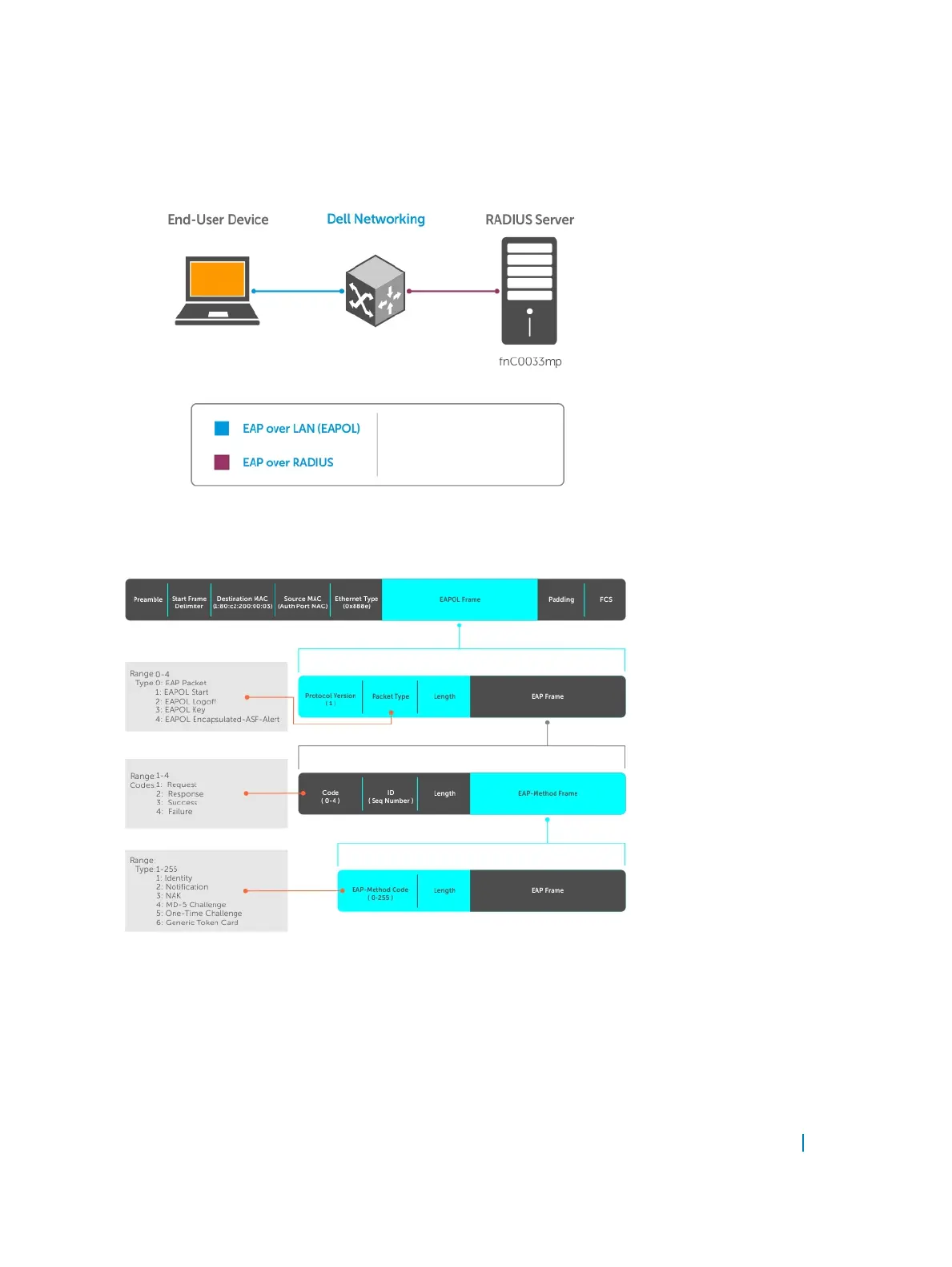 The following figures show how the EAP frames are encapsulated in Ethernet and RADIUS frames.