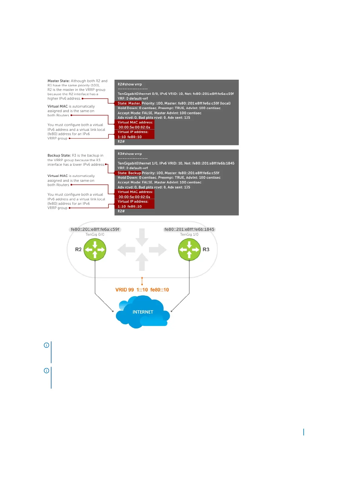 Consider an example VRRP for IPv6 configuration in which the IPv6 VRRP group consists of two routers.