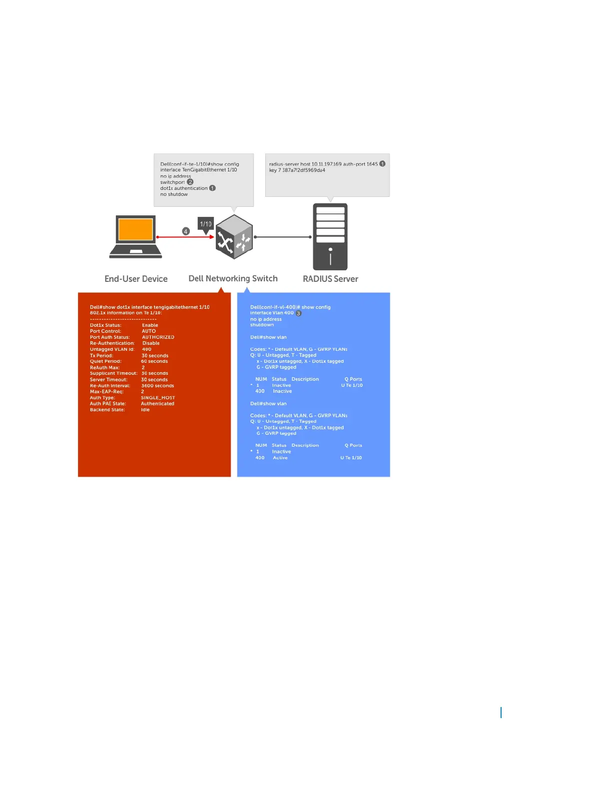 5 Verify that the port has been authorized and placed in the desired VLAN (refer to the illustration in