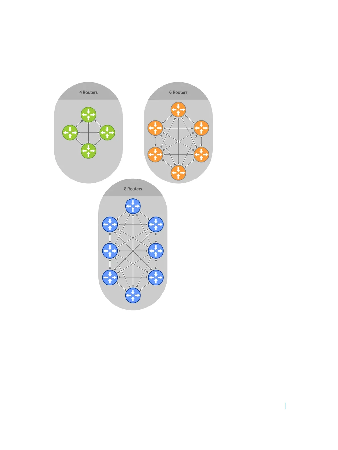 in “full mesh.” As seen in the illustration below, four routers connected in a full mesh have three peers each,