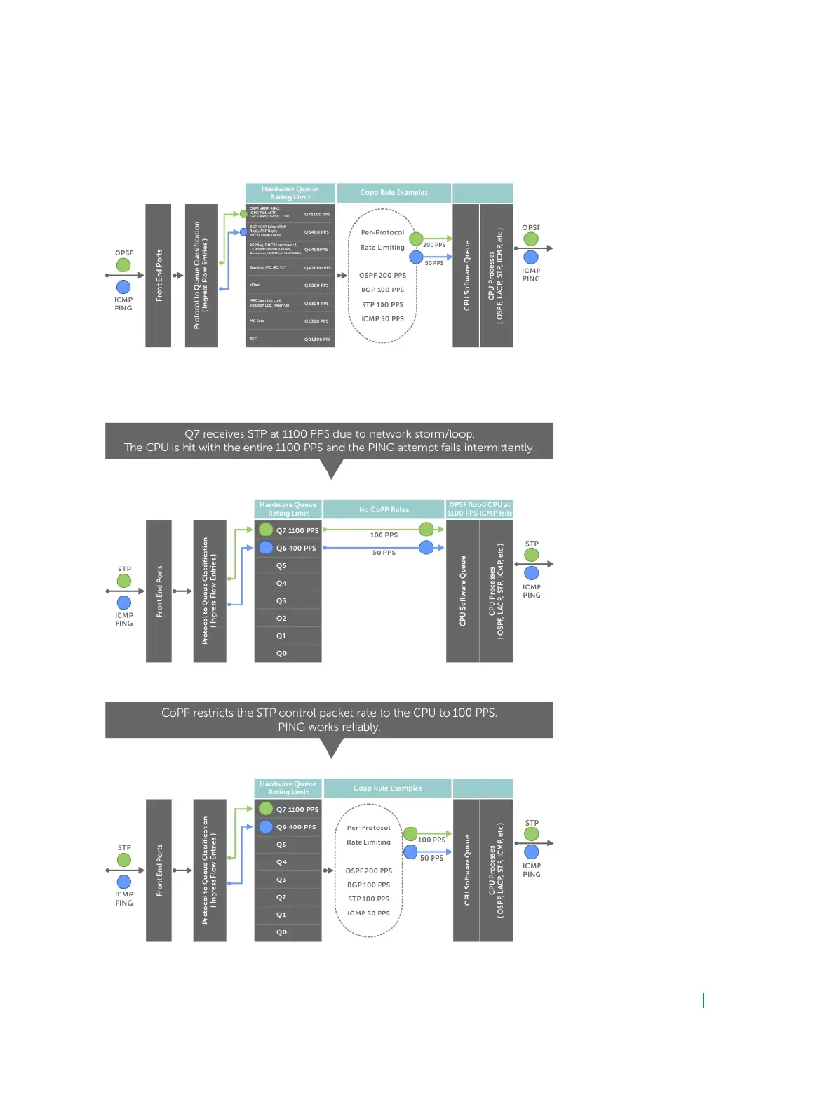 The following illustration shows an example of the difference between having CoPP implemented and not