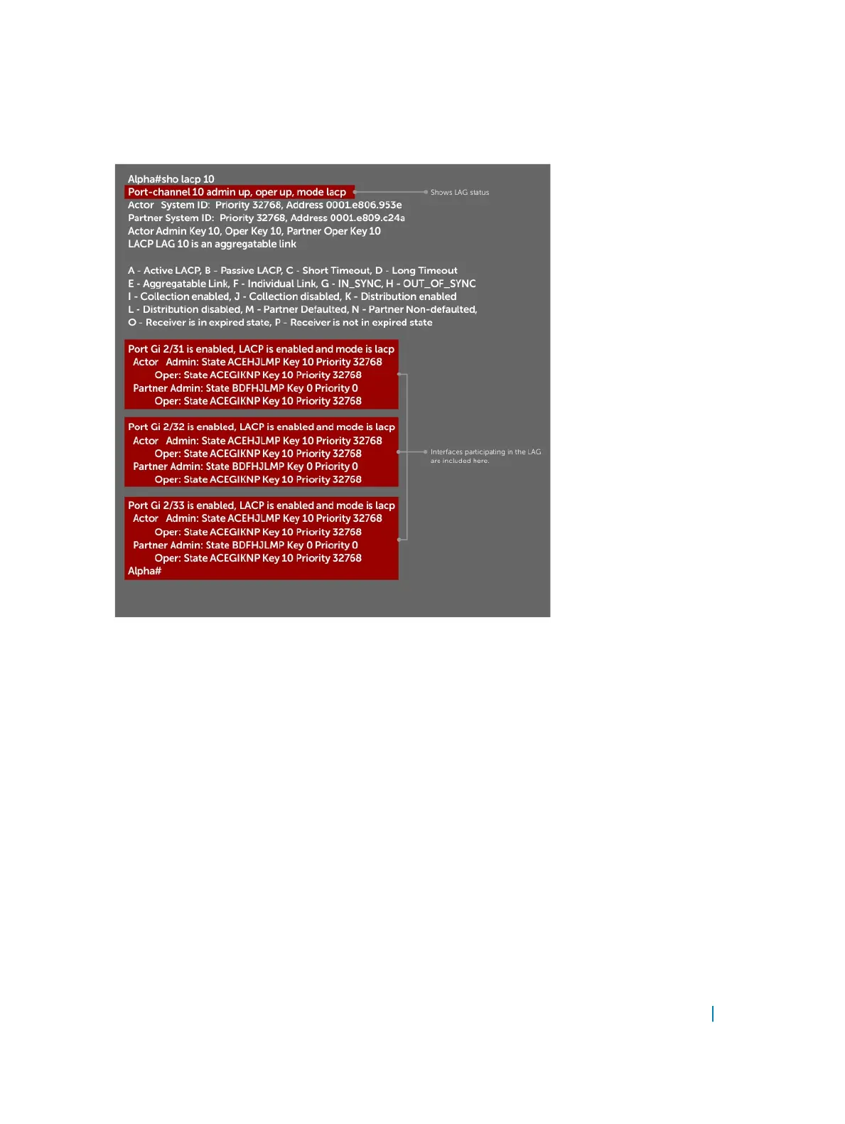 Figure 69. Verifying LAG 10 Status on ALPHA Using the show lacp Command