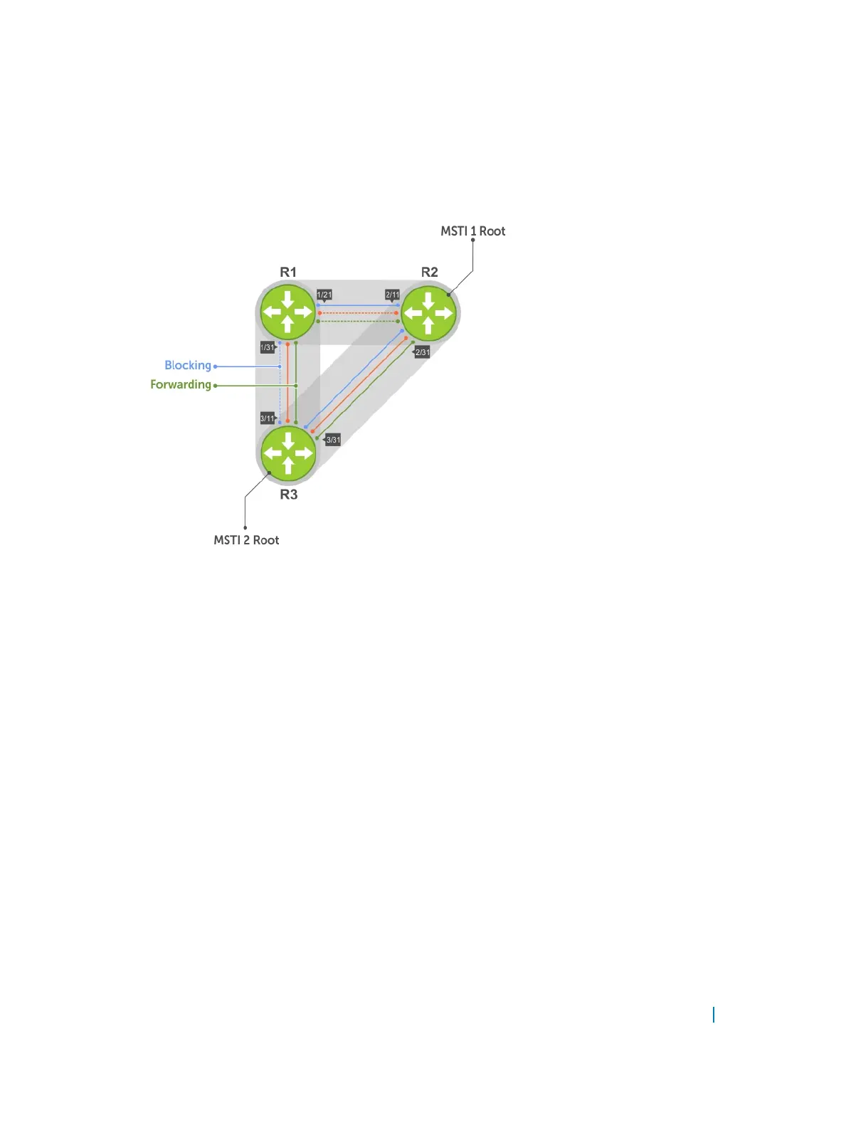 Figure 95. MSTP with Three VLANs Mapped to TWO Spanning Tree Instances