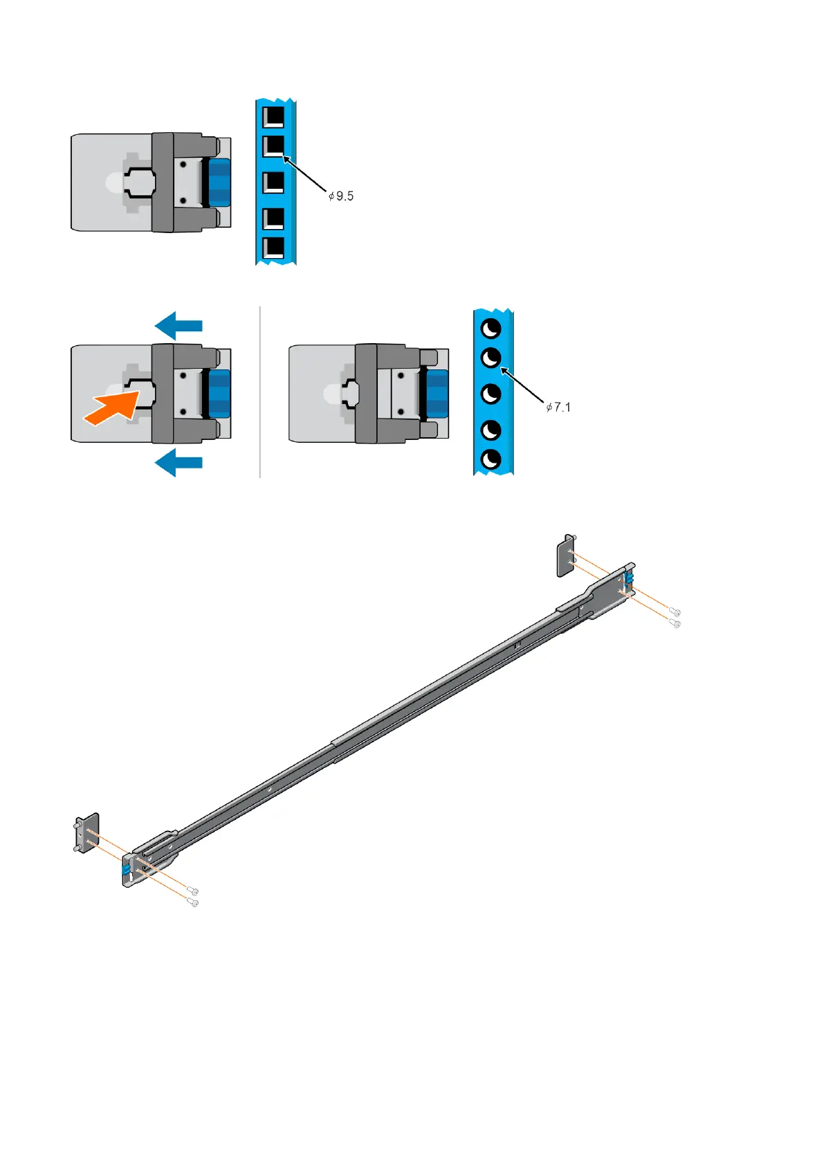 Align the outer rail pegs to the back of the four-post rack and push towards the back to lock the outer rail to the rear post.