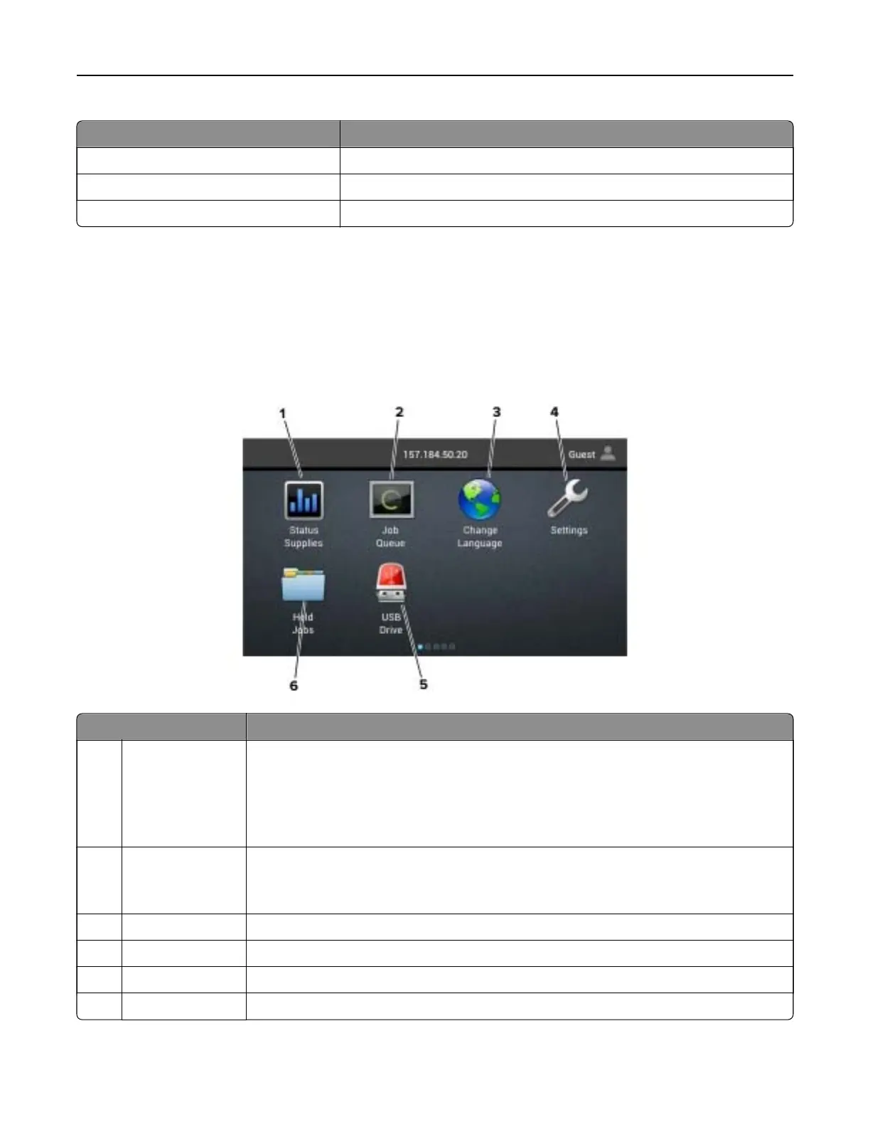When the printer is turned on, the display shows the home screen. Use the home screen buttons and icons to