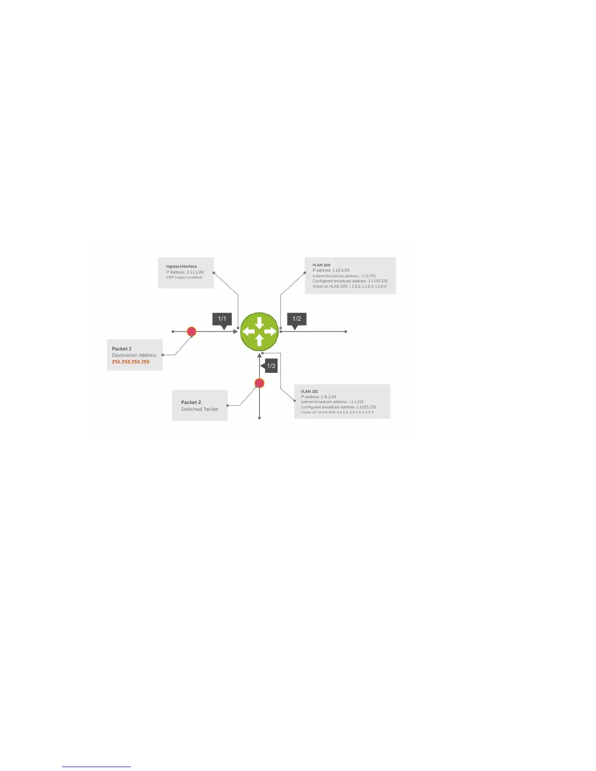 VLANs 100 or 101, the packet is forwarded using the original destination IP address 255.255.255.255.