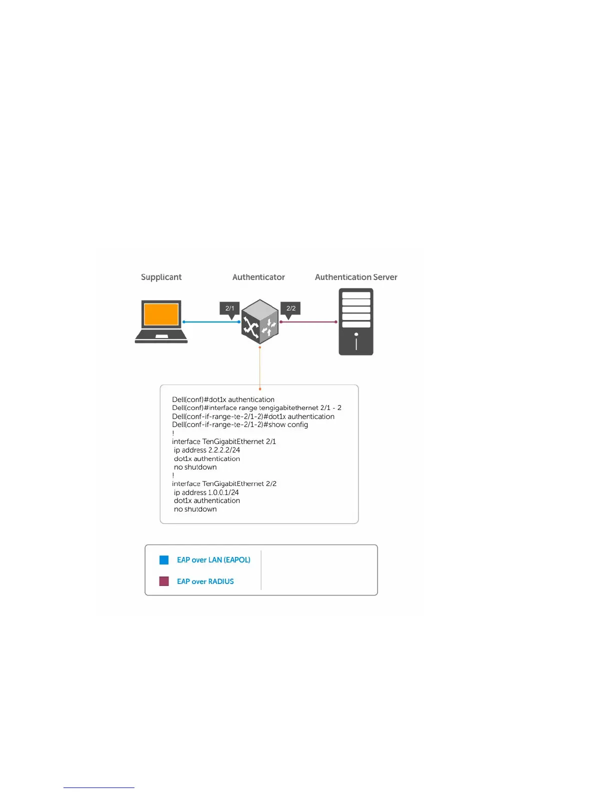 • Dell Networking OS supports 802.1X with EAP-MD5, EAP-OTP, EAP-TLS, EAP-TTLS, PEAPv0, PEAPv1,
