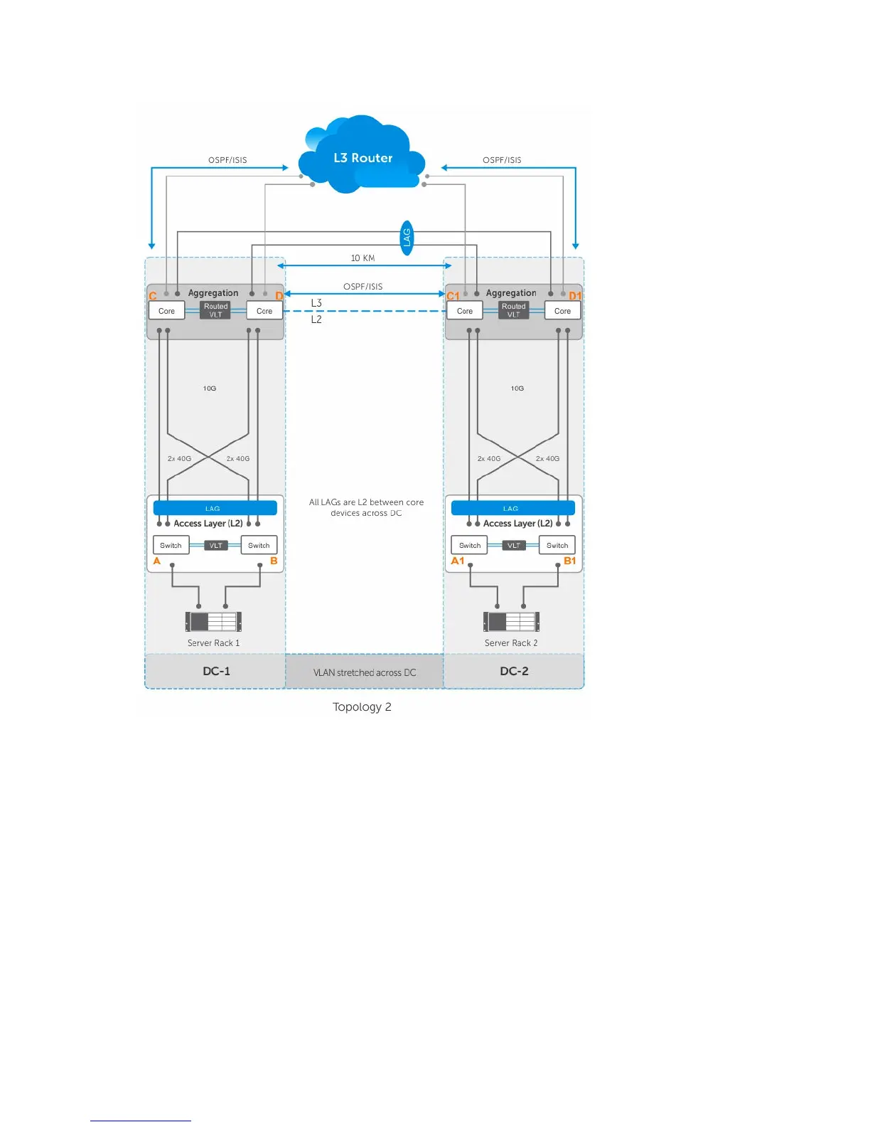 • The above figure shows a sample VLT Proxy gateway scenario. There are no diagonal links in the