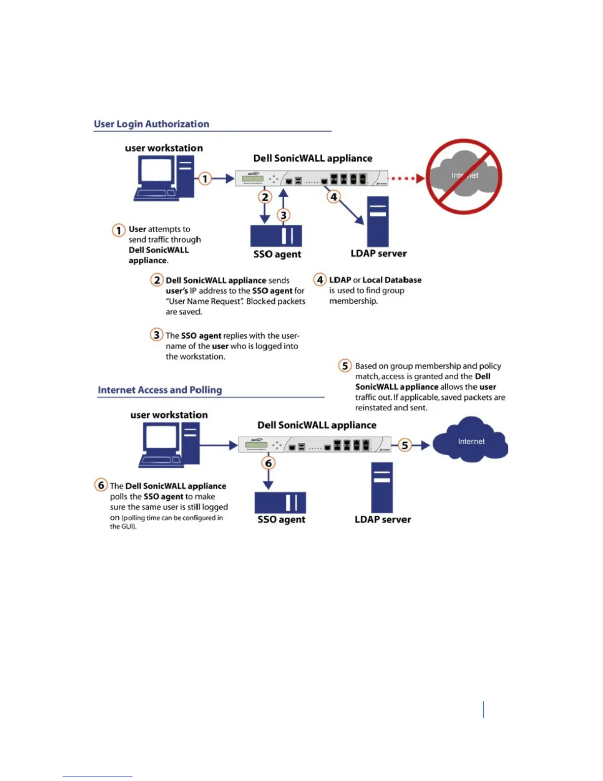 the SSO Agent, the Dell SonicWALL security appliance queries LDAP or the local database to determine group