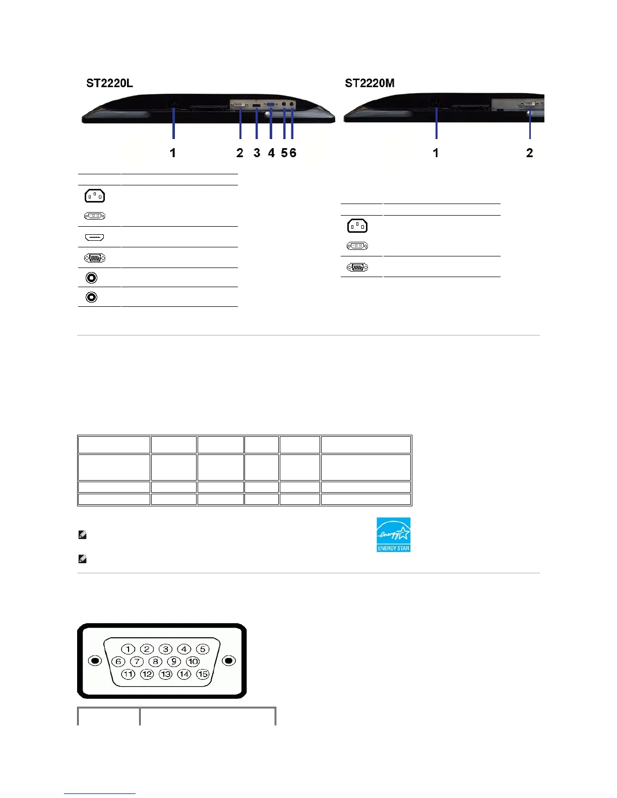 Dell ST2220L - Monitor Specifications; Power Management Modes; Pin Assignments; Vga Connector