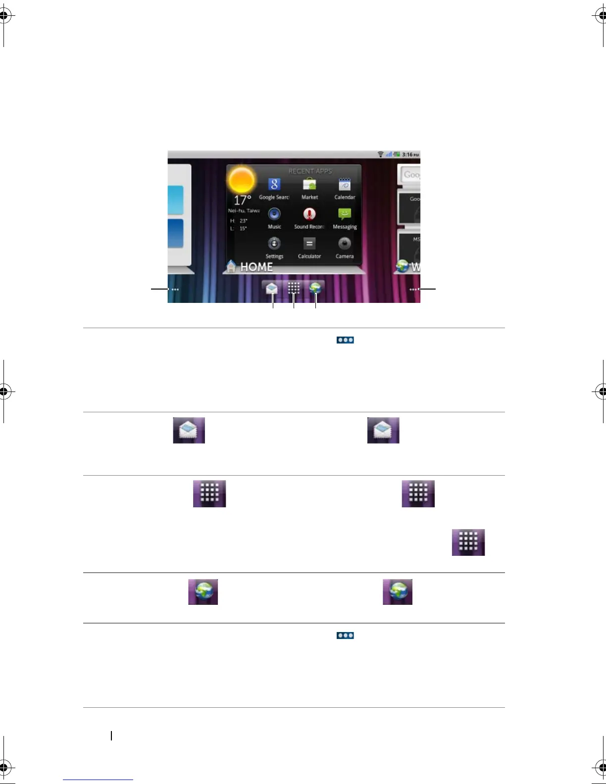 3 Launcher button • Touch the Launcher button to display