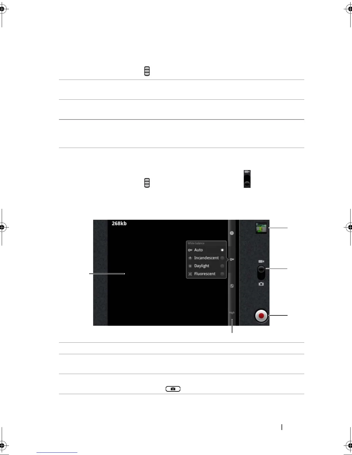 2 Camcorder setting indicator. Touch each indicator to bring up