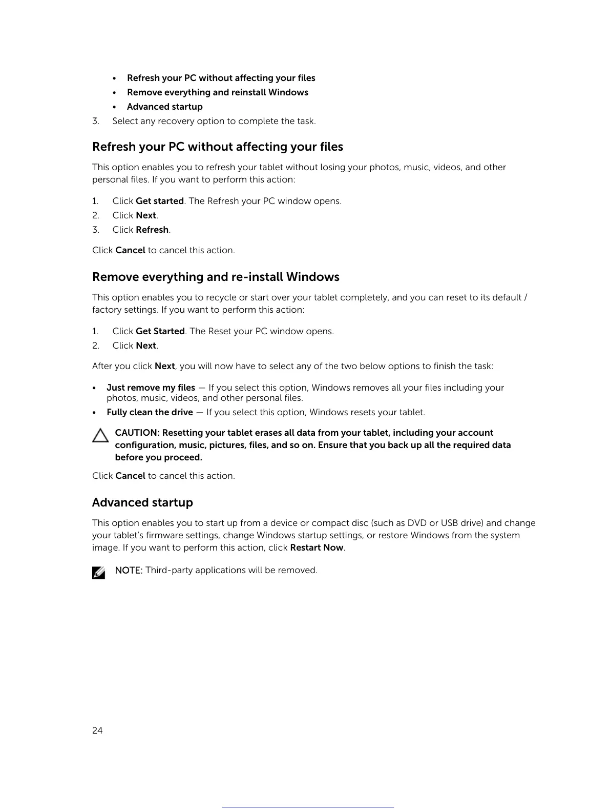 This option enables you to refresh your tablet without losing your photos, music, videos, and other