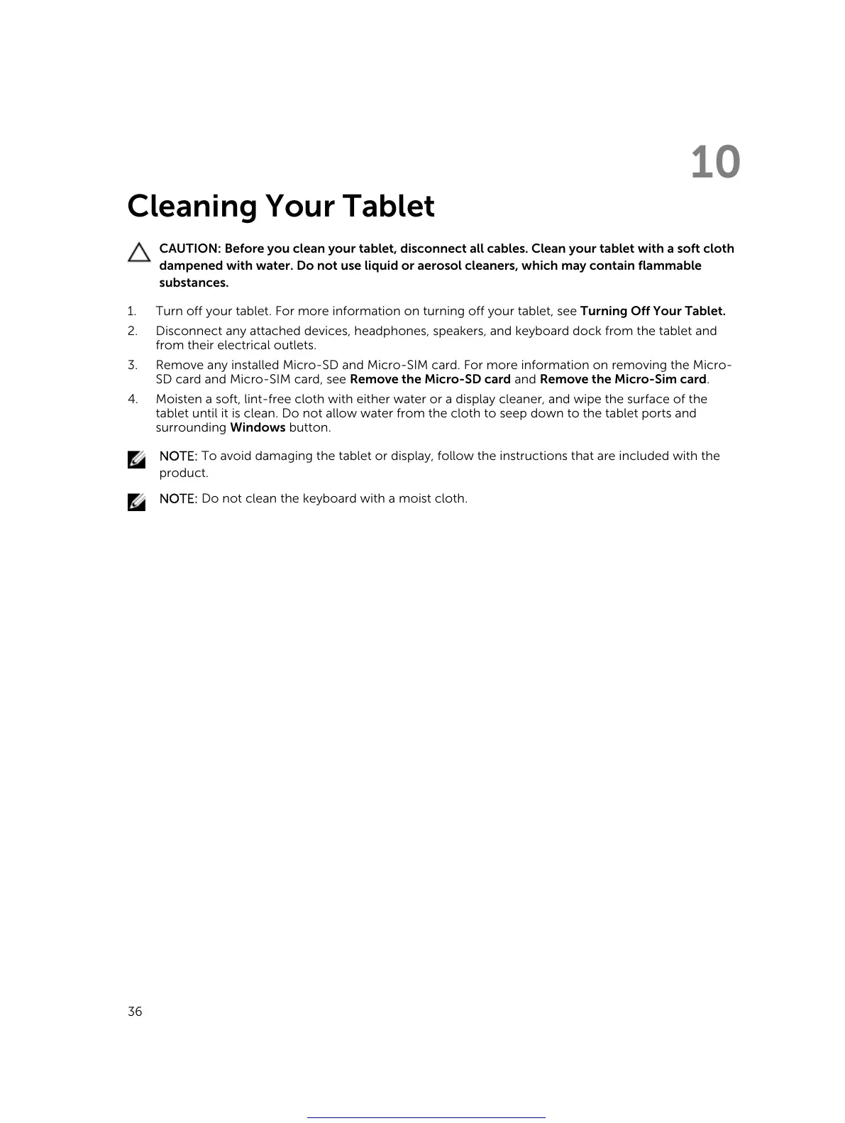 CAUTION: Before you clean your tablet, disconnect all cables. Clean your tablet with a soft cloth