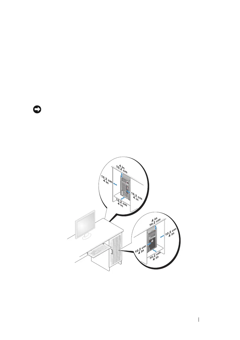 • Leave 10.2 cm (4 in) minimum clearance on all vented sides of the computer