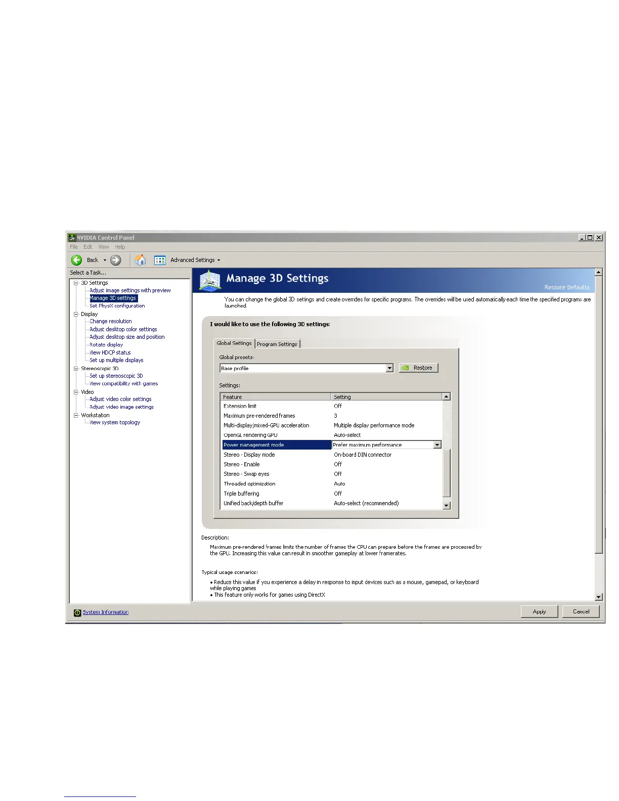 9. For the Power management mode feature, select Prefer maximum performance as shown in the
