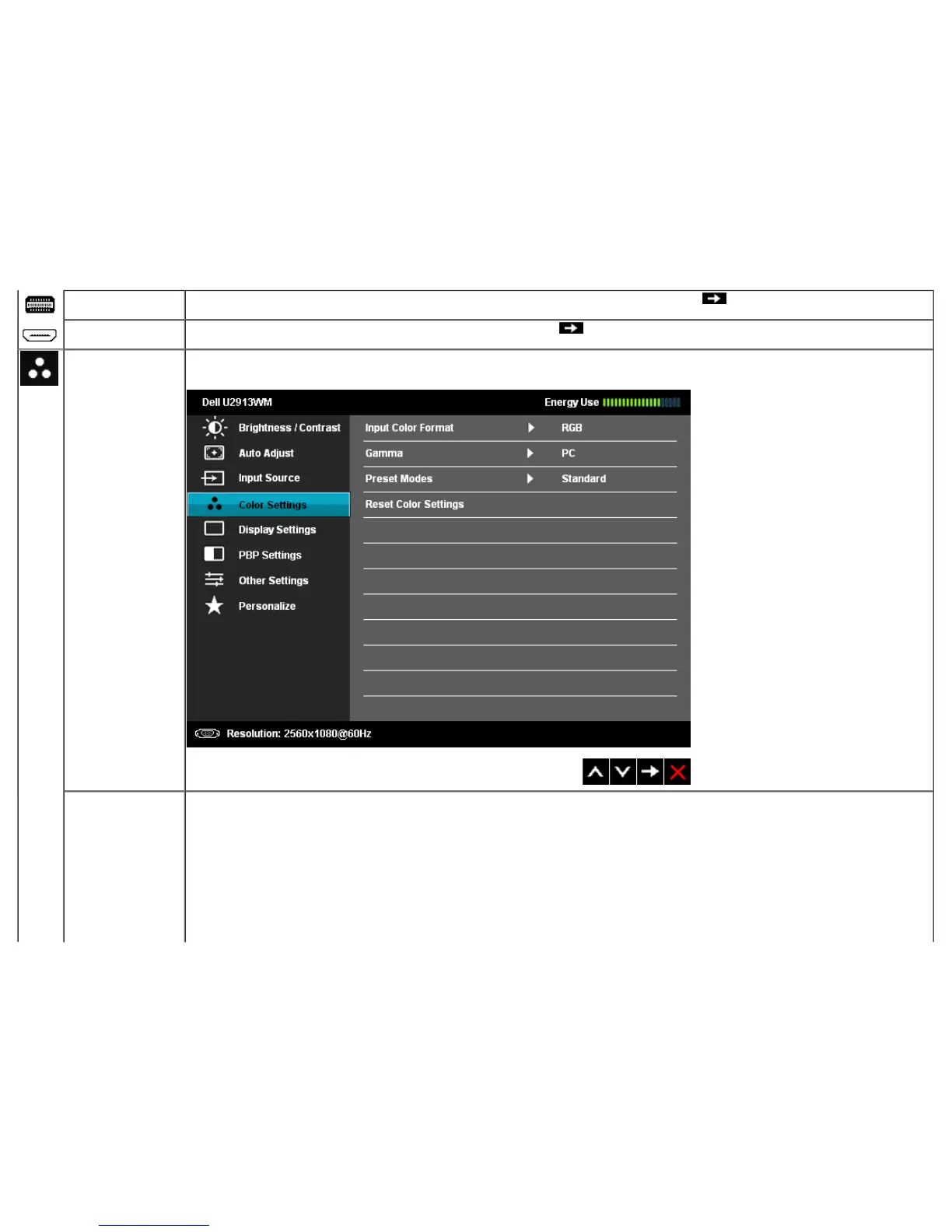 There are different color setting sub-menus for VGA/DVI-D/HDMI/DisplayPort/Mini DisplayPort.