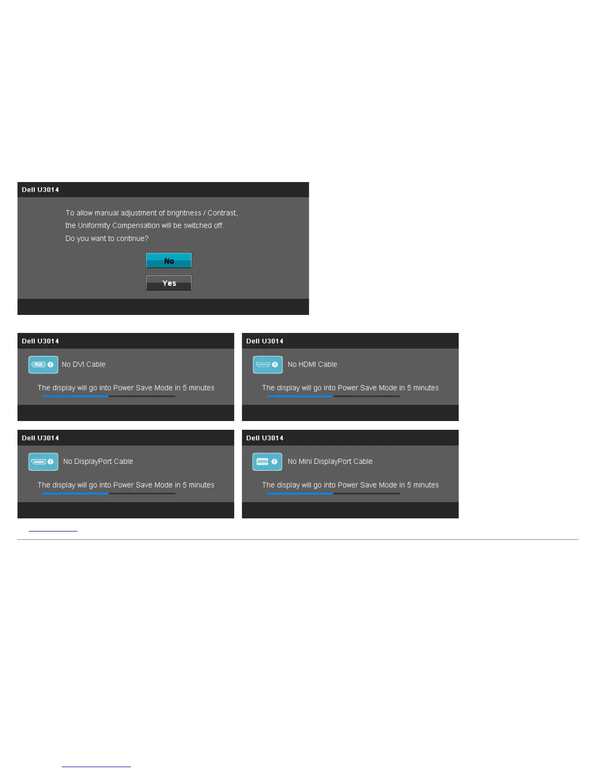 If either DVI-D/DisplayPort/mini DisplayPort/HDMI input is selected but corresponding DVI-D/DisplayPort/mini DisplayPort/HDMI cables is not connected, a floating dialog box as shown below appears.