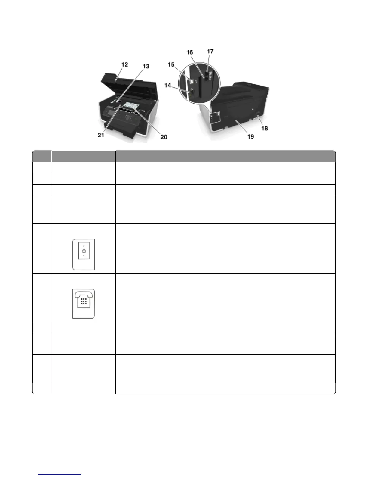 14 Ethernet port Connect your printer to a computer, a local network, an external DSL, or a cable modem.