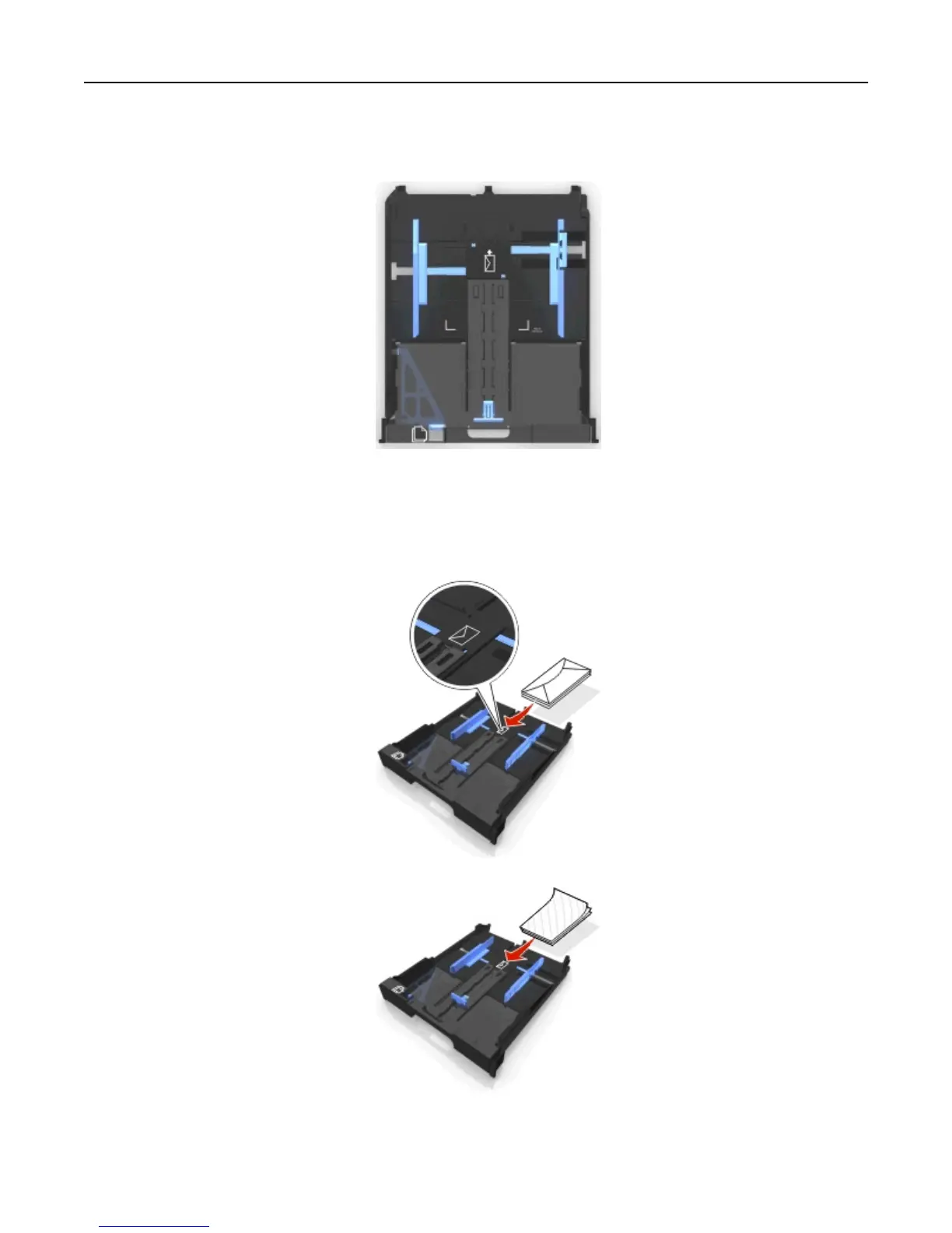 3 Use the envelope icon and the photo paper outline on the bottom of the tray to help you position envelopes or