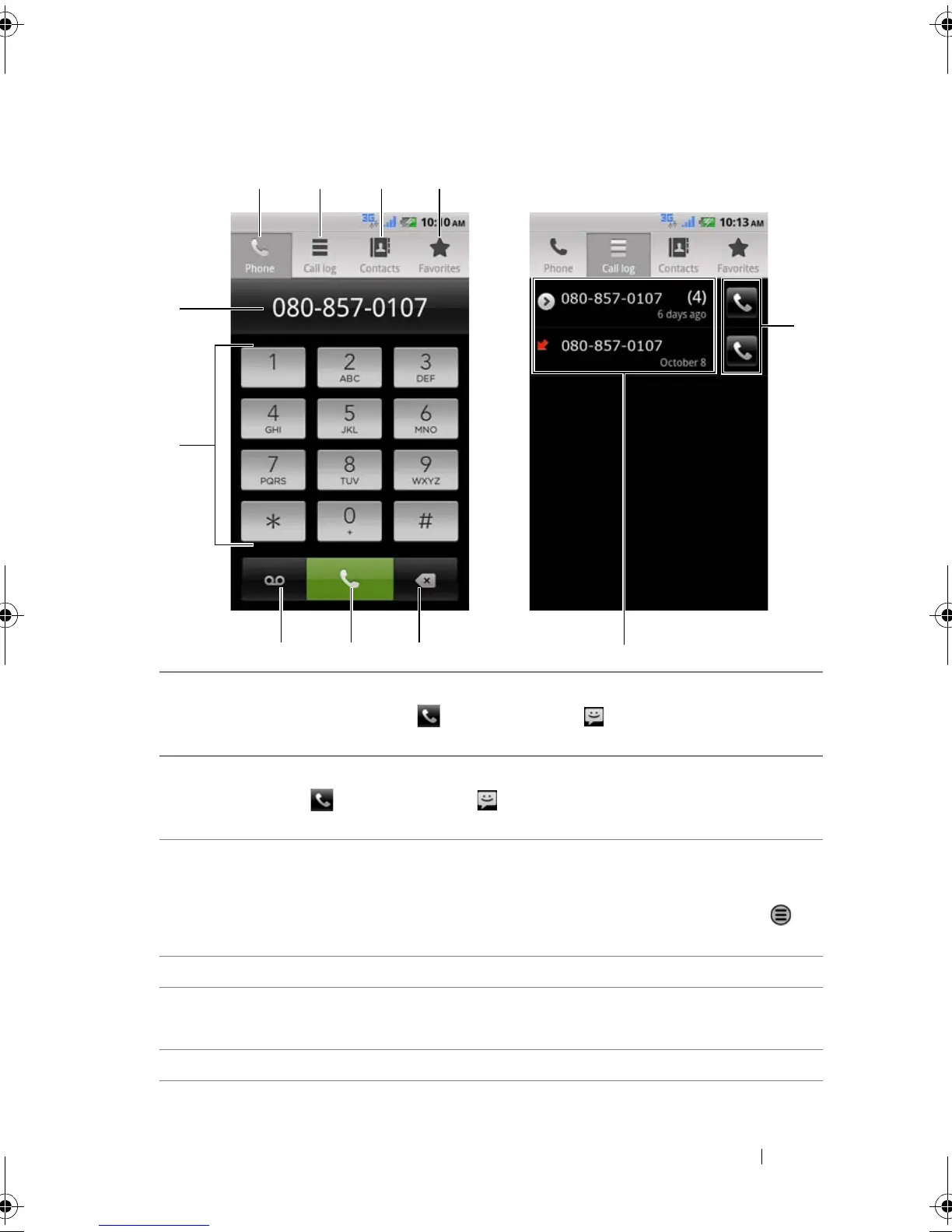 3 Touch to view the call log, call or text message the caller, or save or view