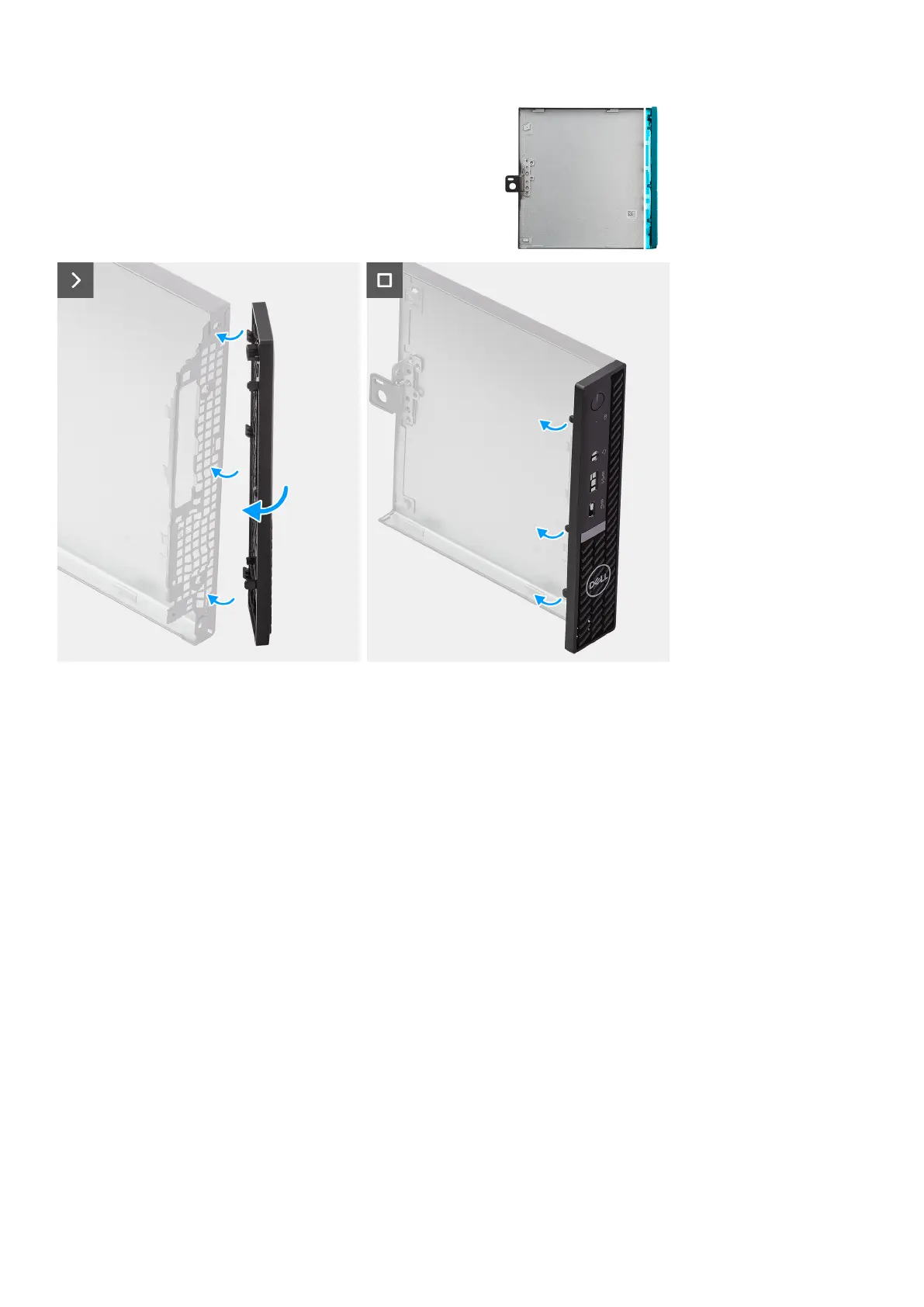 2. Push the left-side of the front bezel towards the side cover, snapping the tabs into position.