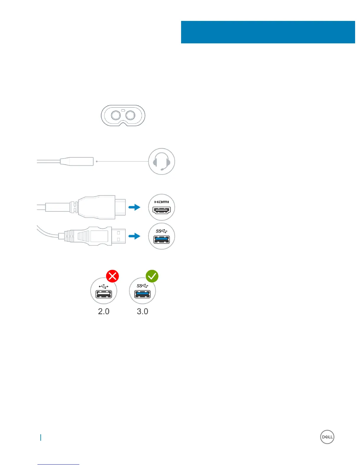1 Connect the USB 3.0 and HDMI cables to their respective ports on your system. Connect your headphones (sold separately) to the