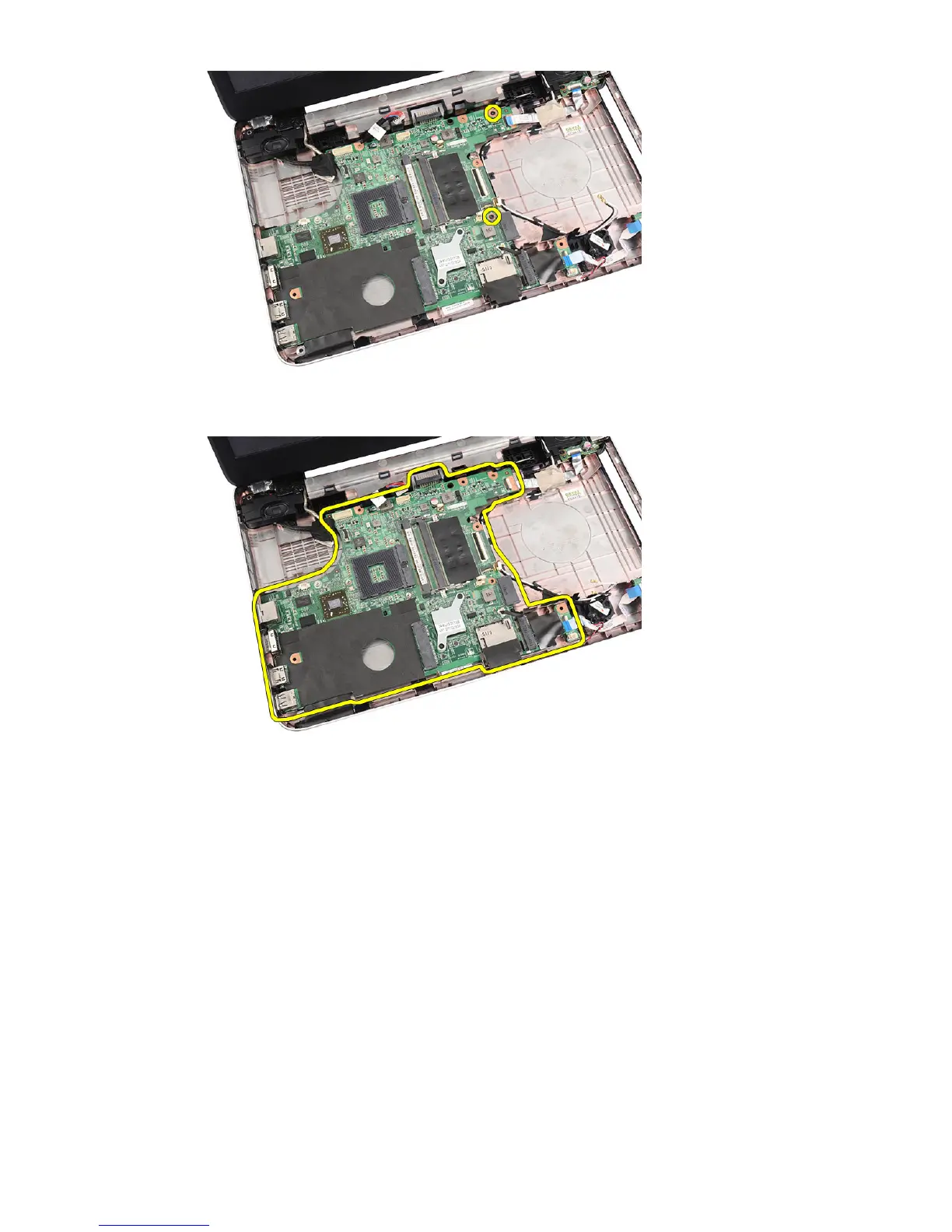 14. Lift up the system board at an angle and slide it out from the LAN, VGA,