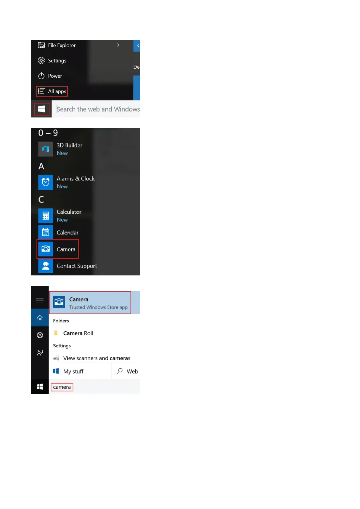 Si la aplicación de la cámara no está disponible en la lista aplicaciones, búsquela.