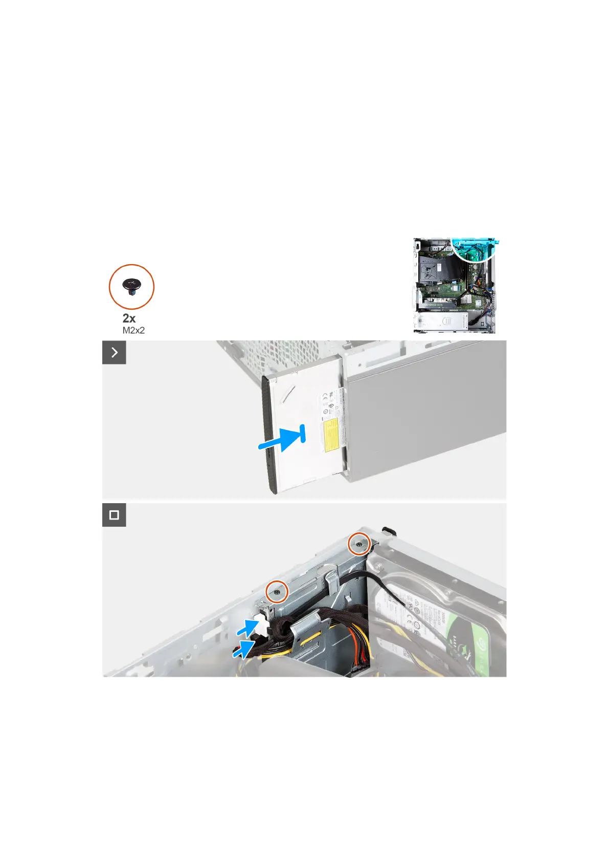 2. Replace the two screws (M2x2) that secure the optical drive to the optical-drive cage.