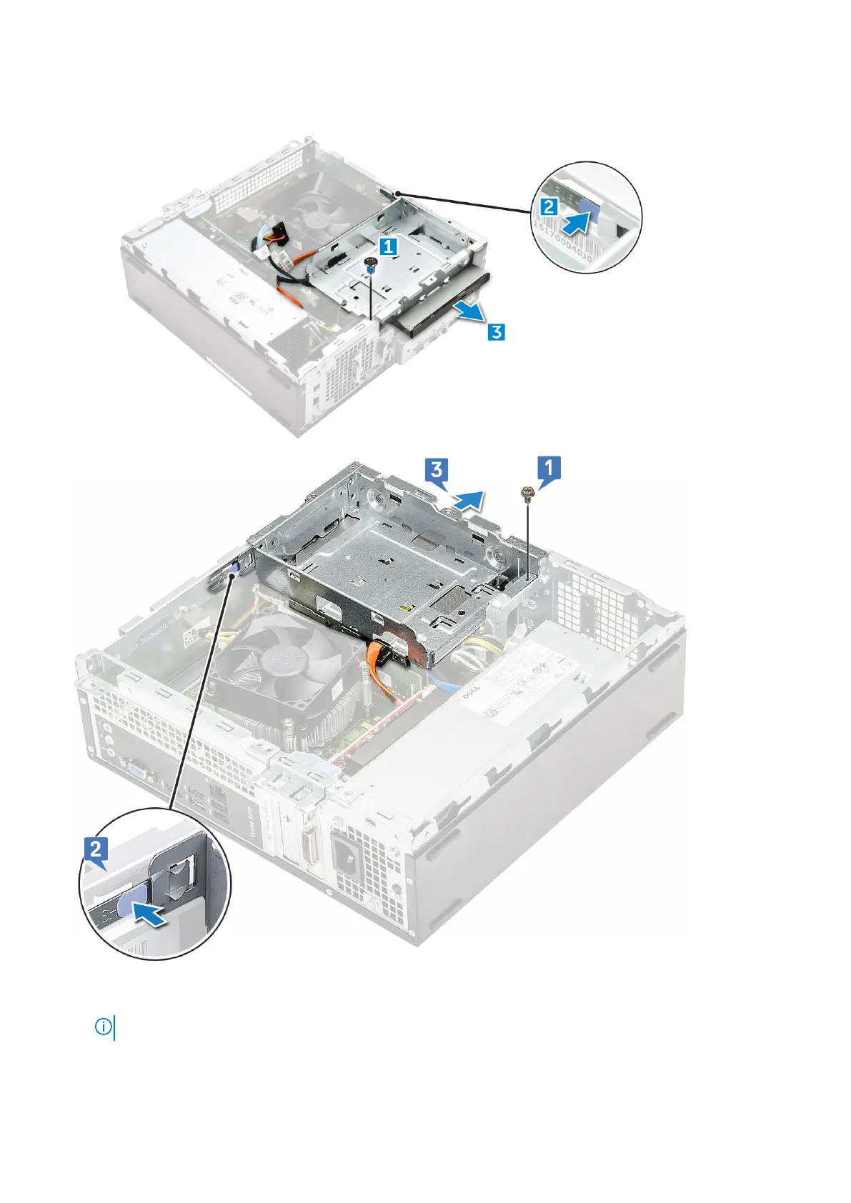 b. Slide the optical drive [2] and lift it up to remove it from the chassis [3].