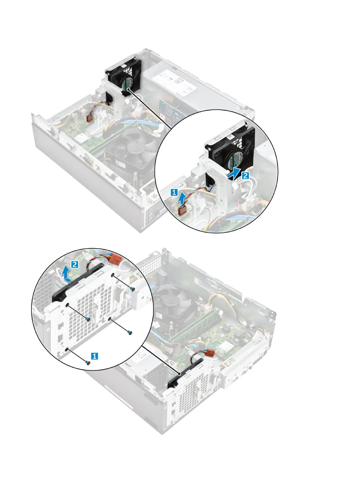 4. Remove the M6xL10 screws that secure the system fan to the computer chassis and remove it from the computer. [1,2]