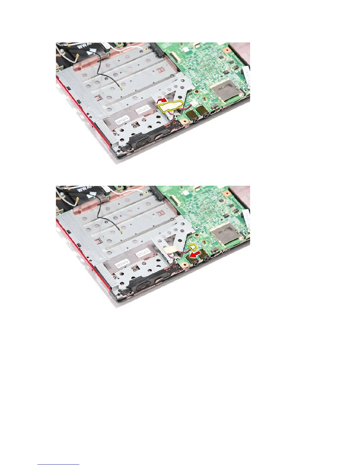 12. Disconnect the speaker cable from its connector on the system board.