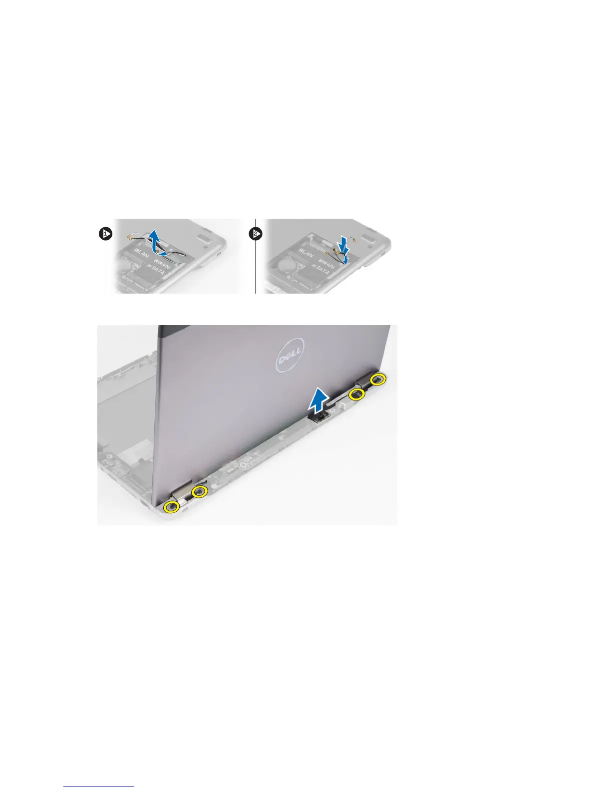 4. Disconnect the display cable from the system board and remove the screws that secure the display assembly to