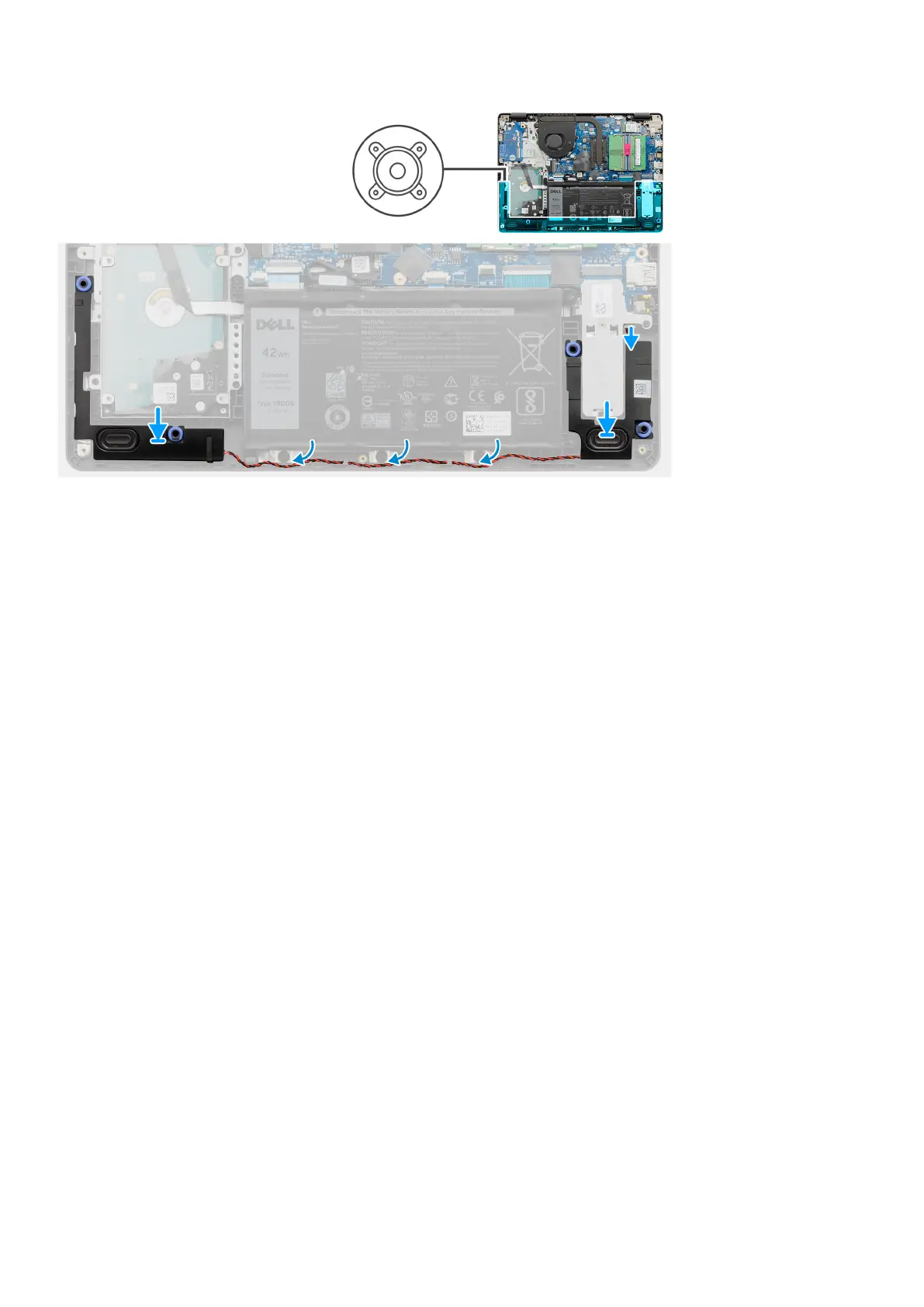 1. Using the alignment posts and rubber grommets, place the speakers in the slots on the palm rest.