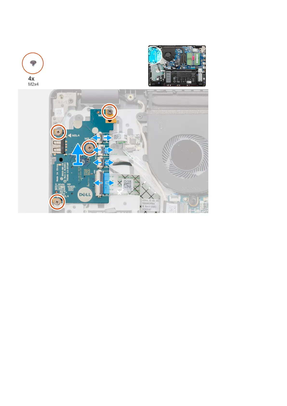 4. Remove the four (M2x4) screws that secure the IO board to the palmrest, and remove the IO board from the system.