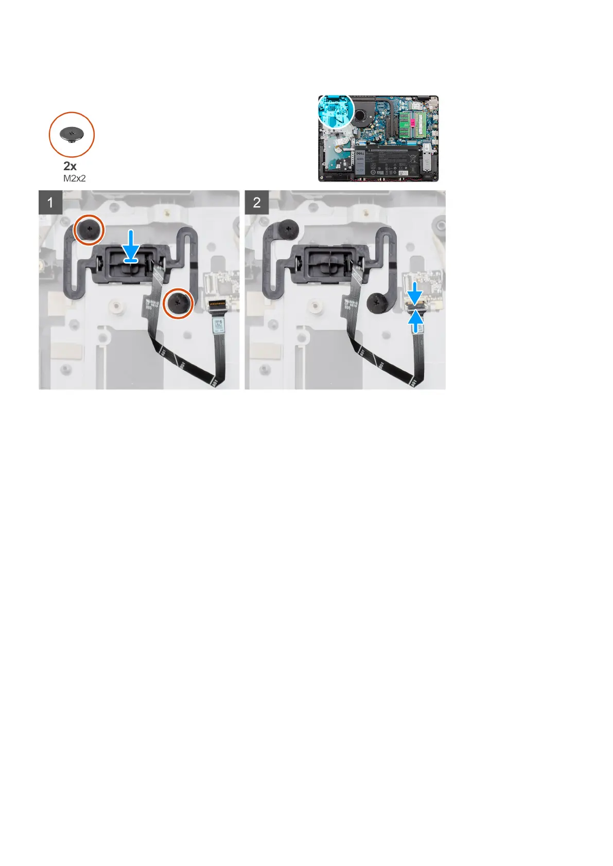 2. Install the two (M2x2) screws to secure the power button to the palmrest.
