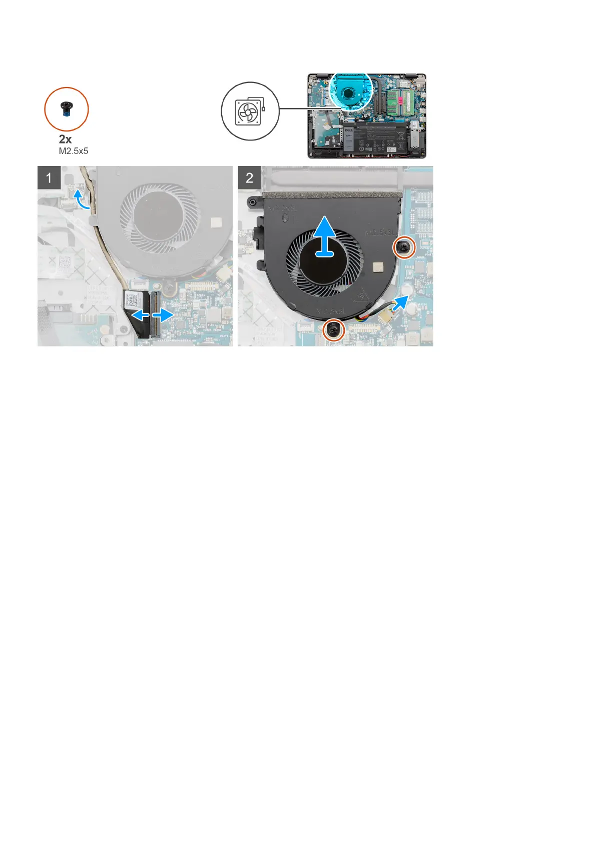 1. Remove the two screws (M2.5x5) that secure the fan to the palm-rest and keyboard assembly.