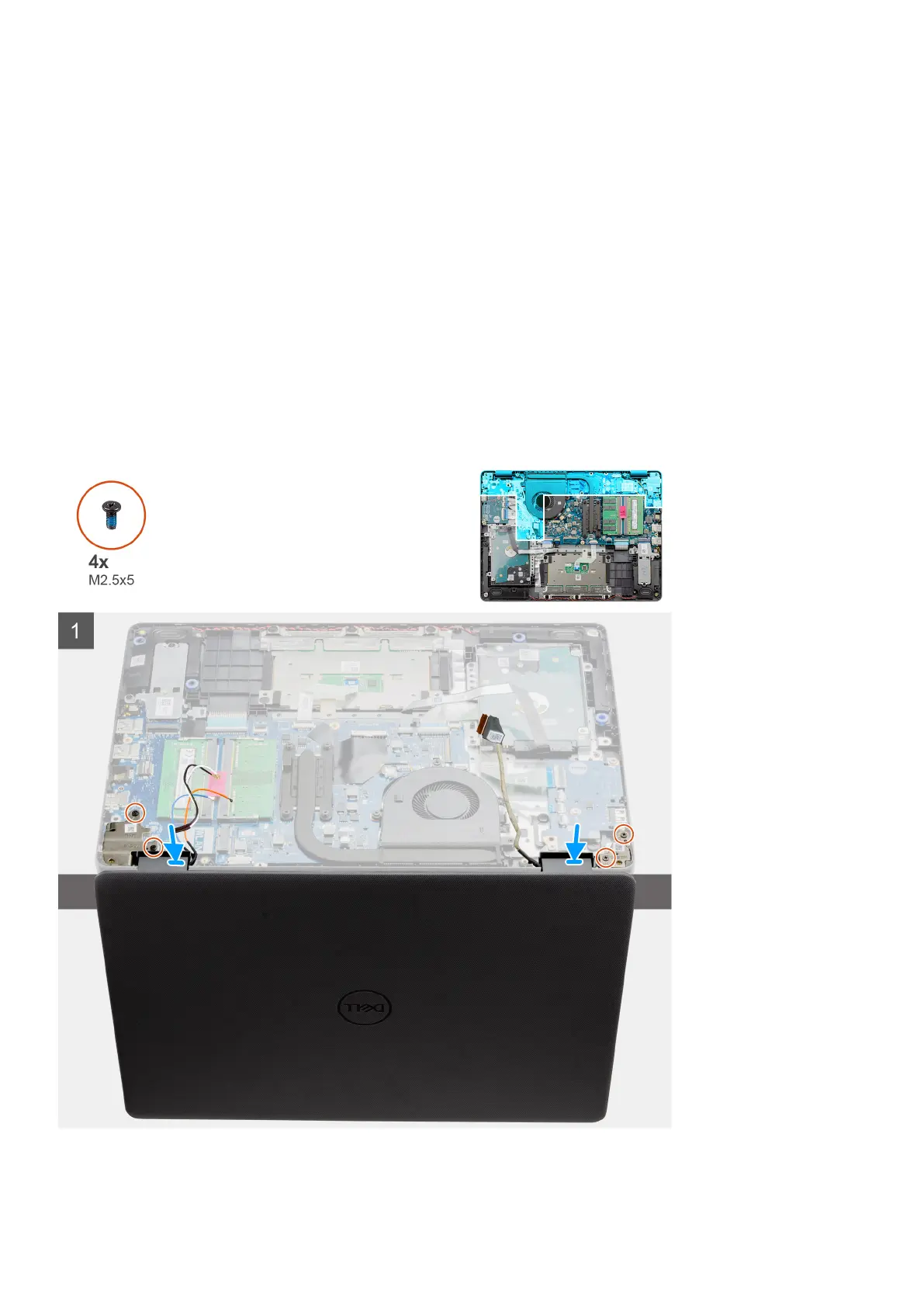 4. Remove the six screws (M2.5x5) that secure the display hinges to the palm-rest and keyboard assembly.