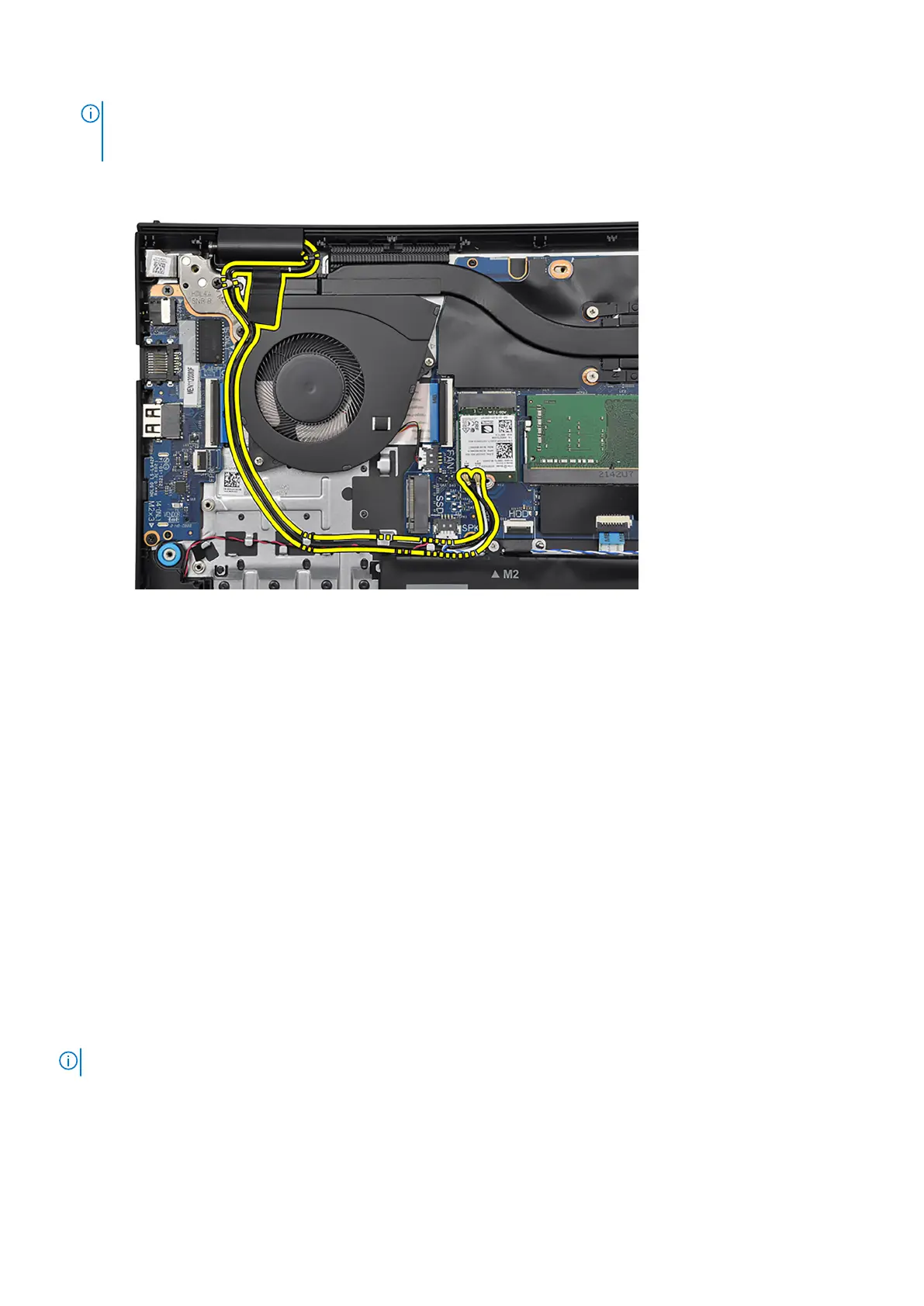 4. Route the WLAN antenna cables through the routing guides on the palm-rest and keyboard assembly and adhere the tape to