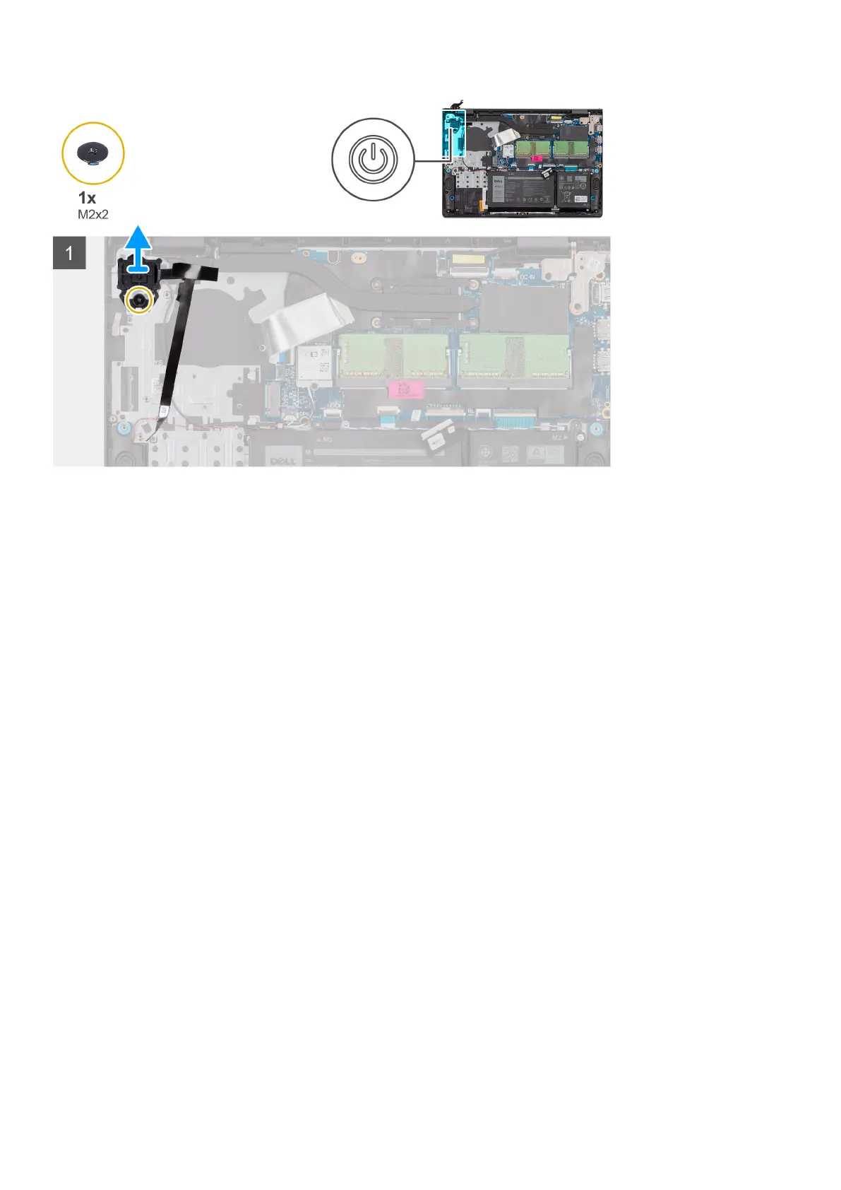 1. Remove the (M2x2) screw that secures the power button with optional fingerprint reader to the palm-rest and keyboard