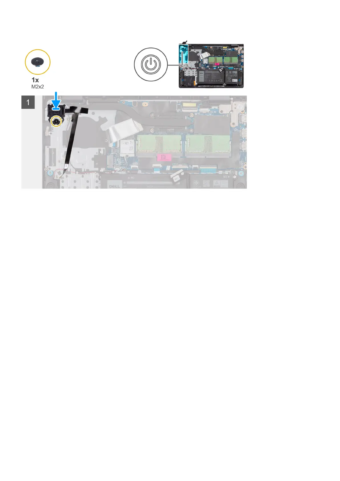 2. Replace the (M2x2) screw that secures the power button with optional fingerprint reader to the palm-rest and keyboard