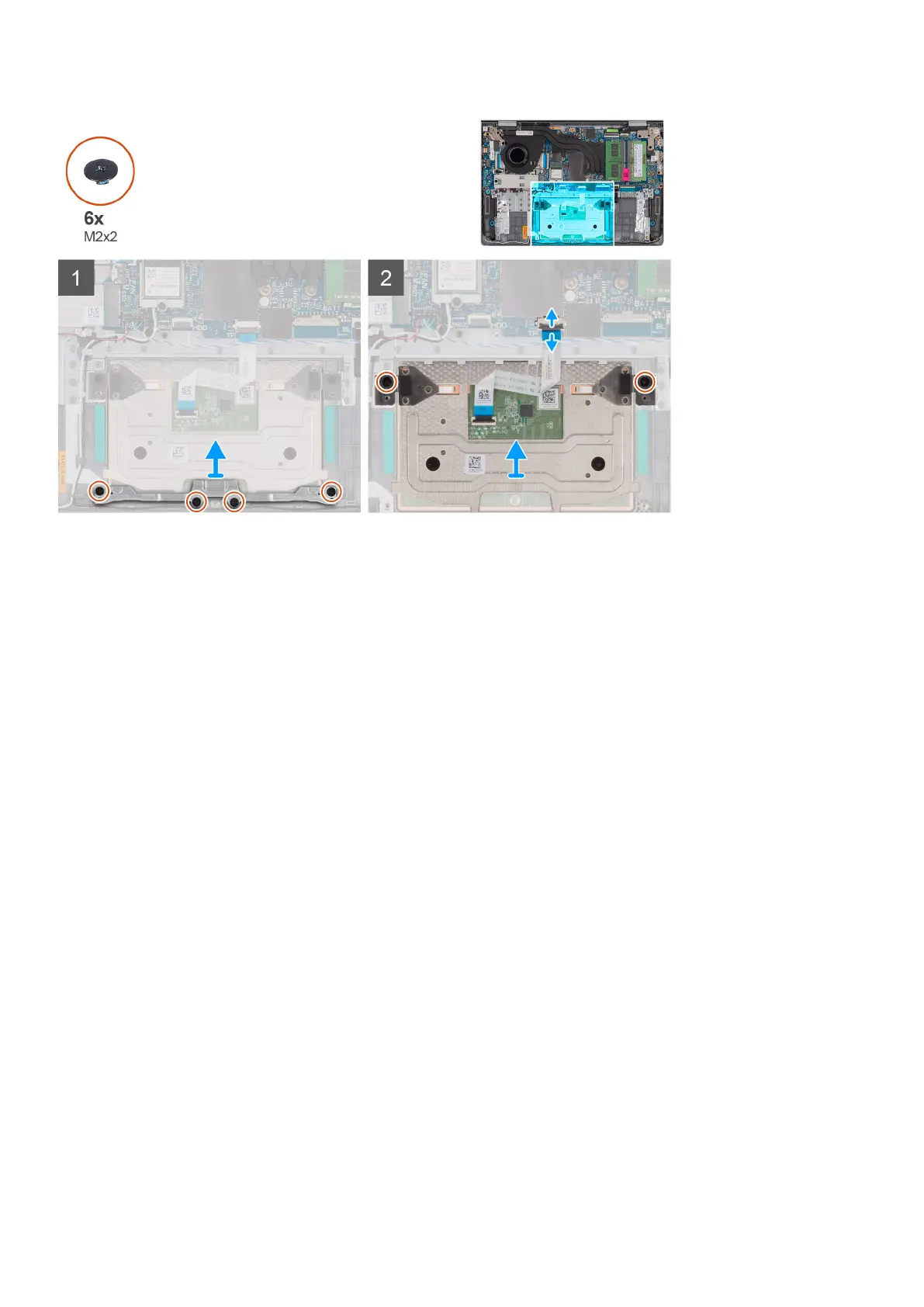 1. Remove the four (M2x2) screws that secure the touchpad bracket to the palm-rest and keyboard assembly.
