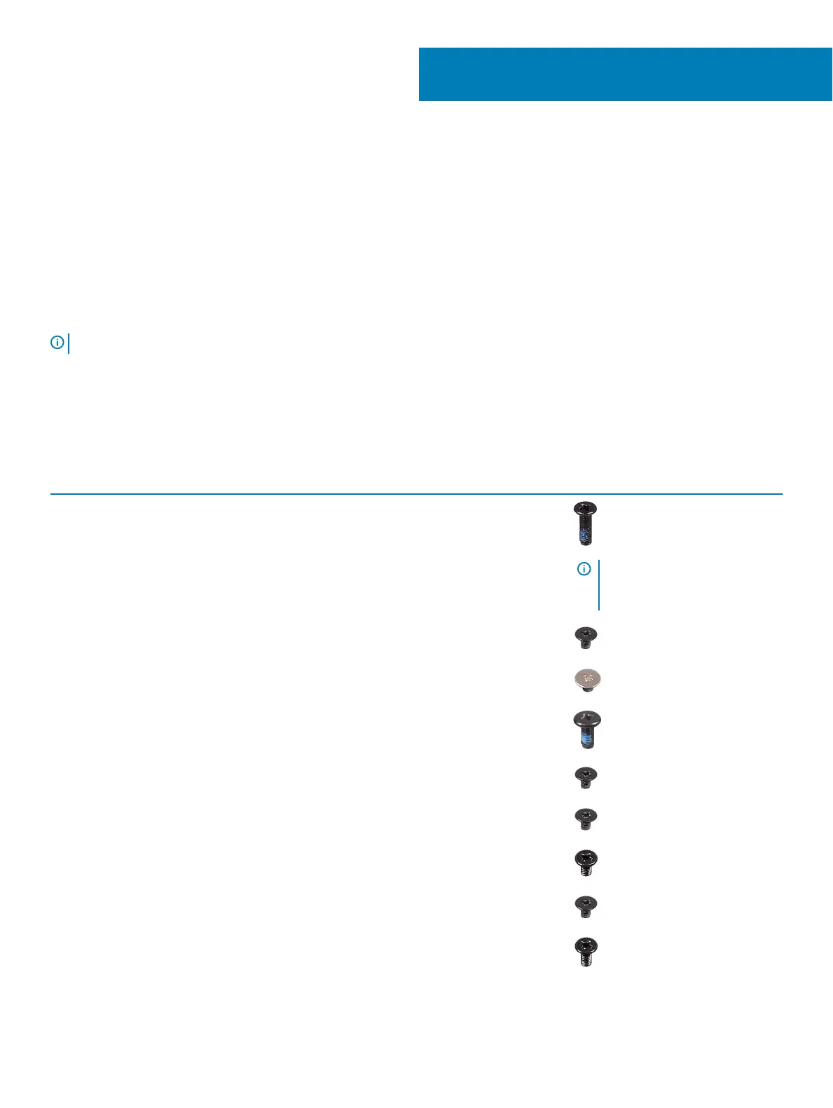 The table provides the list of screws that are used for securing dierent components.
