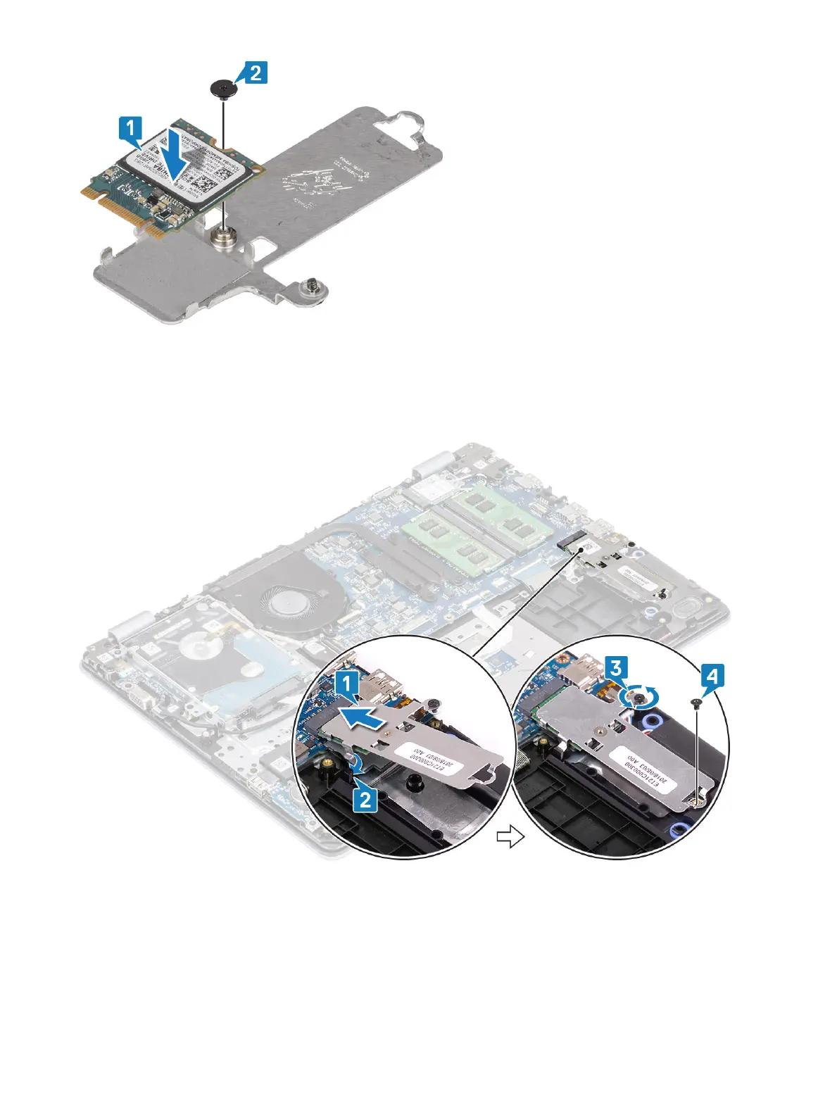 4 Slide and insert the tab solid-state drive into the solid-state drive slot [1, 2].